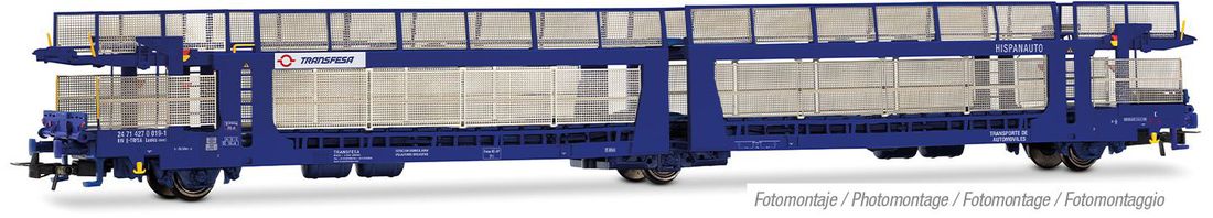 Transfesa modernized 50 older car transporters of type 63, creating the Laeks 63c series. These 26.50 m long, three-section wagons are used internationally, connecting Spanish automotive plants with distribution centers in France, Germany, and Northern Europe. The modernization primarily involved the upper deck, featuring a longer ramp and a reinforced mechanism for modern, heavier vehicles, as well as the installation of vandal protection. The Electrotren model faithfully reproduces these features with a high level of detail.