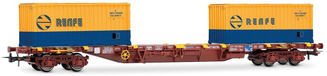RENFE MMC3 container wagon loaded with 2 x 20' containers "RENFE", oxide red livery