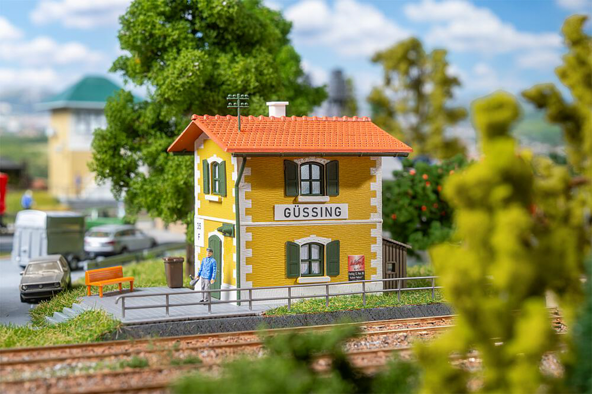 Just like the »Güssing« station, this station attendant's cottage also impresses with its vibrant yellow colour scheme - a real eye-catcher on any layout. The base, cornices and friezes are digitally printed and provide white accents. Ideal for giving the model railway landscape a new coat of paint.