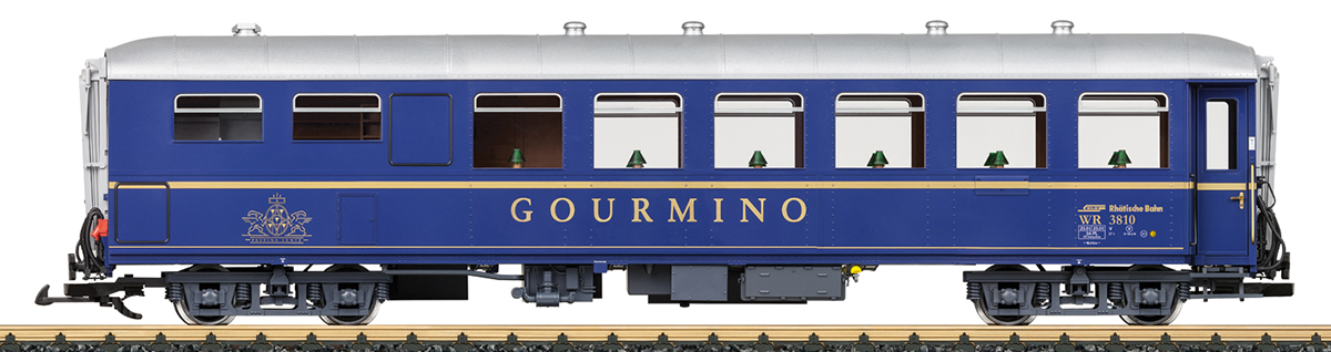 This dining car WR 3810 is used on the RhB for the providing gastronomical service to passengers. It is prototypically painted and lettered for Era VI. It has interior details, interior lighting, and doors that can be opened. Length over the buffers 66 cm / 26“.