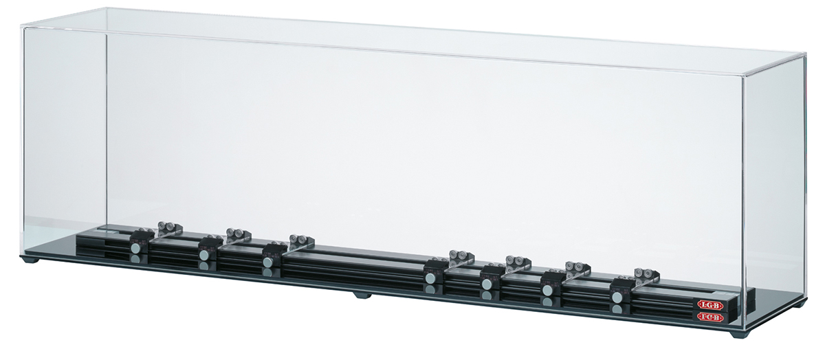 This is a display case with a roller test stand. This display case goes with the American type Shay gear drive steam locomotive, but it can also be used with other LGB models. There are 7 roller blocks that can be adjusted individually. The interior height of the display case is 24 cm / 9-7/16“ from the roller blocks.