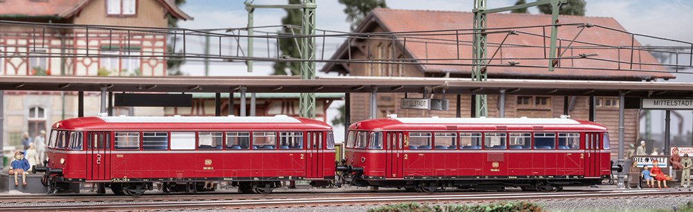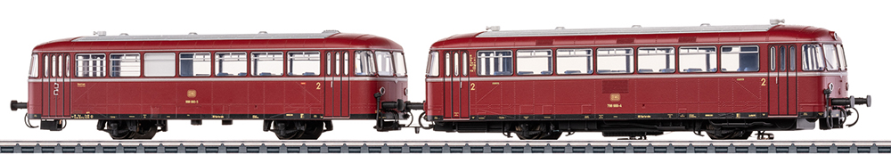 Prototype: Class 798 railbus motor car and Class 998 railbus control car of the German Federal Railway (DB). Original purple-red livery. Motor car road number 798 666-4, control car road number 998 660-5. Operating condition early 1970s.