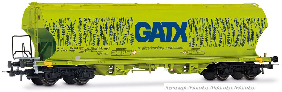 4-axle D-GATX grain silo wagon with rounded side walls, neon green "grain" color scheme with large "GATX" logo