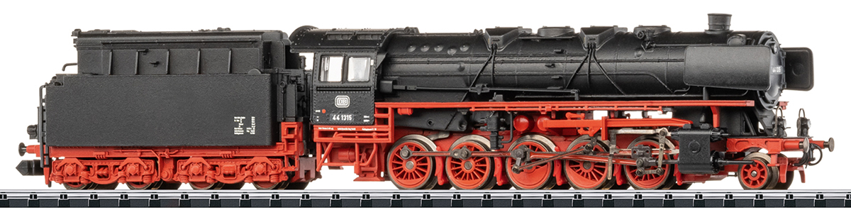 Prototype: Class 44 heavy freight steam locomotive with a standard 2´2´T34 oil tender of the German Federal Railroad (DB). Black/red livery. Cab with two side windows, standard Witte smoke deflectors, leading wheelset with spoked wheels, without smokebox central locking, with inductive train control (Indusi) magnets on both ends. Locomotive road number 44 1315.