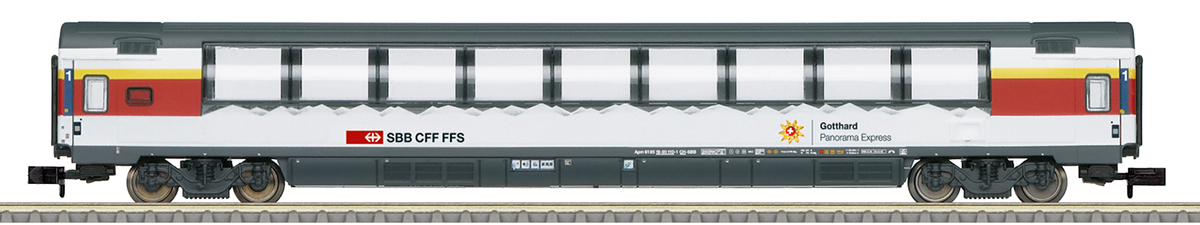 Prototype: Swiss Federal Railways (SBB/CFF/FFS) type SRm express train coach. Open-plan coach with high viewing windows extending to the roof.
