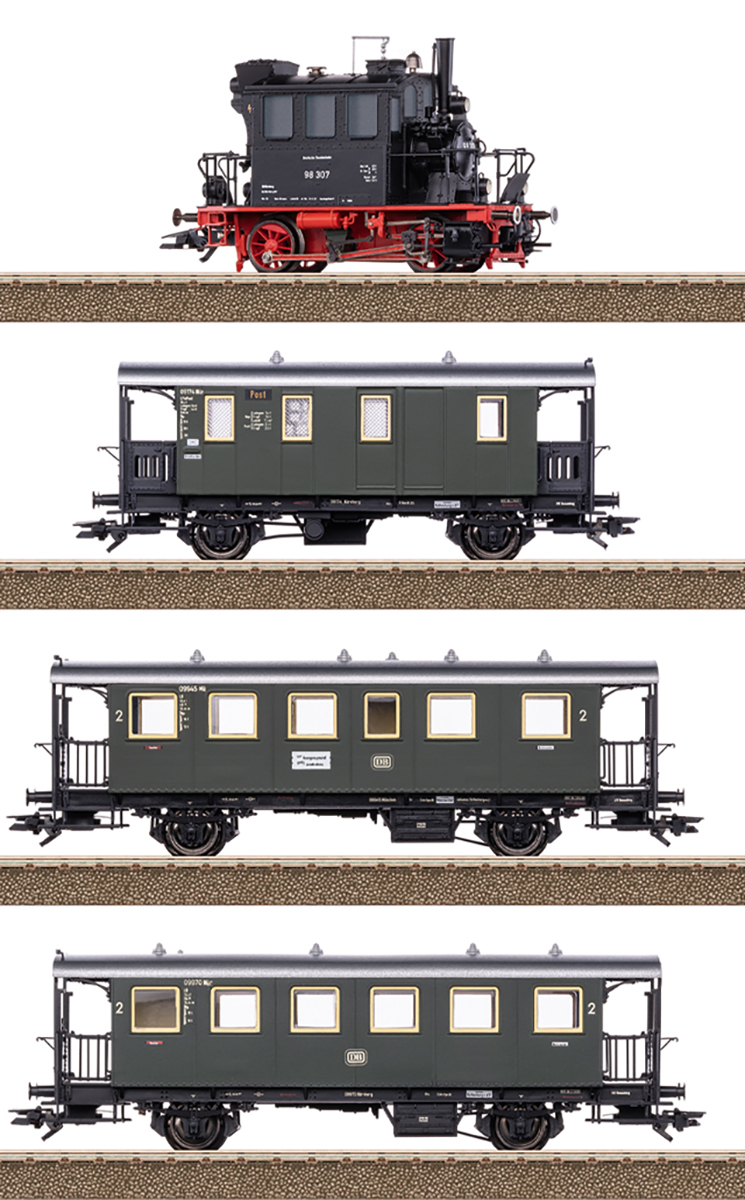 Prototype: German Federal Railroad (DB) class 98.3 “Glaskasten” (“Glass Box”) (former Bavarian PtL 2/2) with a jackshaft and triple headlights and three Bavarian style local railroad cars. One baggage and mail car and two passenger cars, 3rd class. The cars look as they did in Era III around 1957.