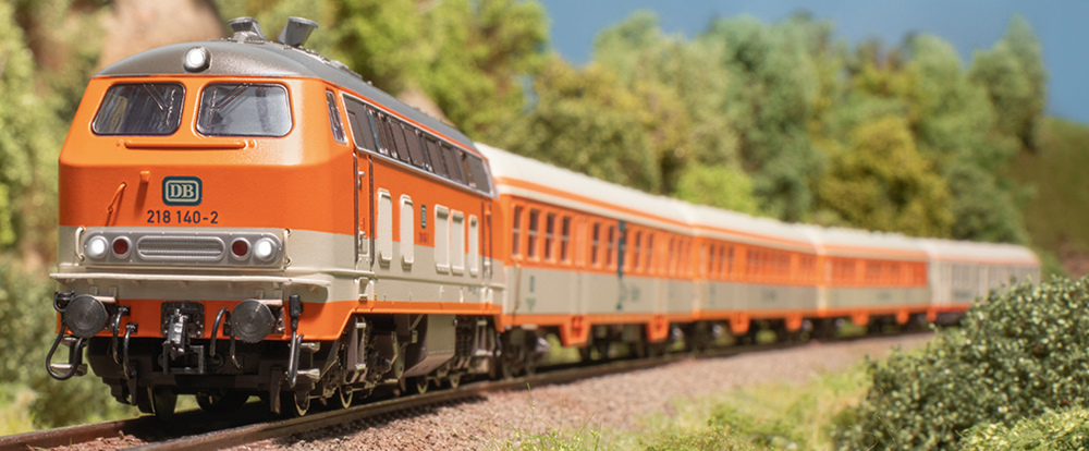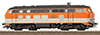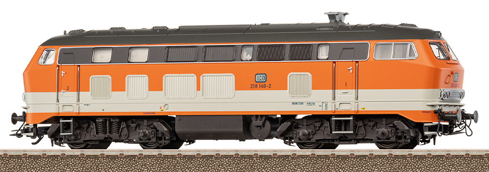 Class 218 diesel locomotive of the German Federal Railroad (DB). Pure orange/pebble gray livery. Road number 218 140-2. Operating condition from 1985 onwards.