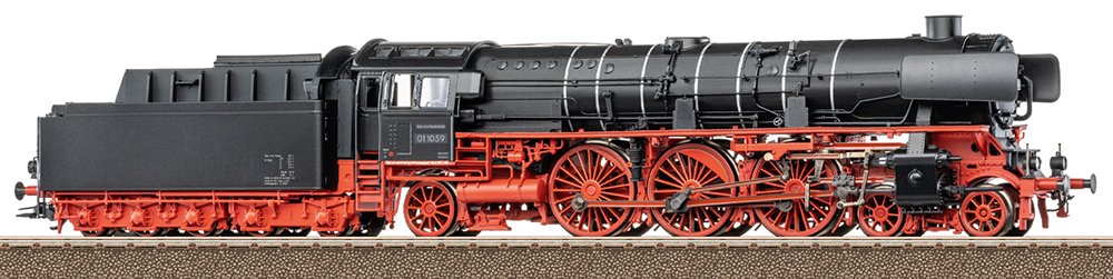 Prototype: German Federal Railroad (DB) class 01.10 express steam locomotive with a new high-performance boiler design and a type 2’3 T38 tender. Black basic paint scheme with red running gear. Version without streamlined fairing. The model features silver boiler bands. Dual headlights. Witte smoke deflectors and an inductive magnet on one side. Loco road number 01 1059. The loco looks as it did after the boiler conversion around 1955/56.