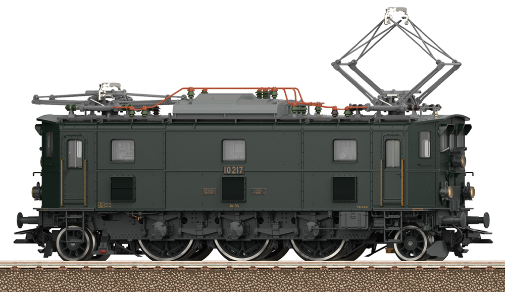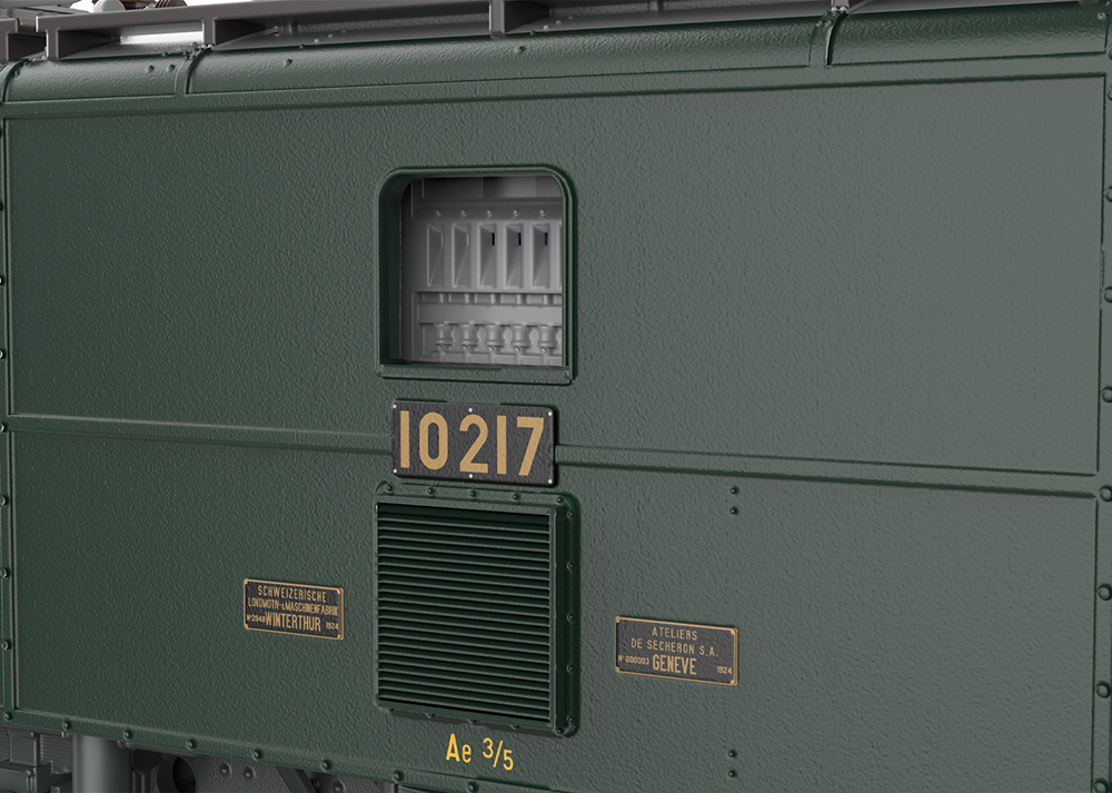 Prototype: Swiss Federal Railways (SBB/CFF/FFS) Ae 3/5 electric locomotive. With end plates and wrong-way signal above the upper headlight. Fir green livery with gray chassis. Locomotive road number 10217. Operating condition 2022.