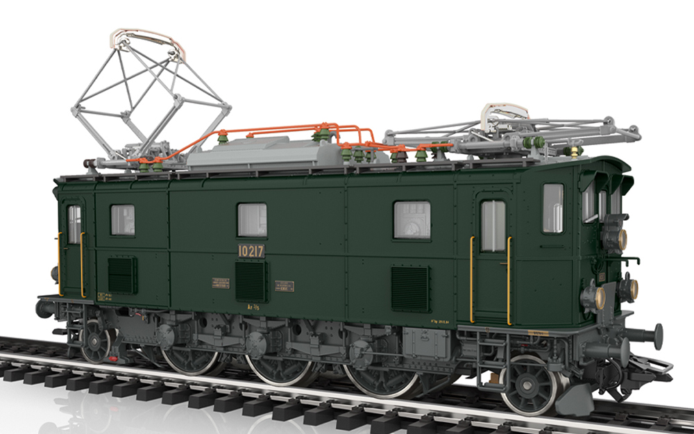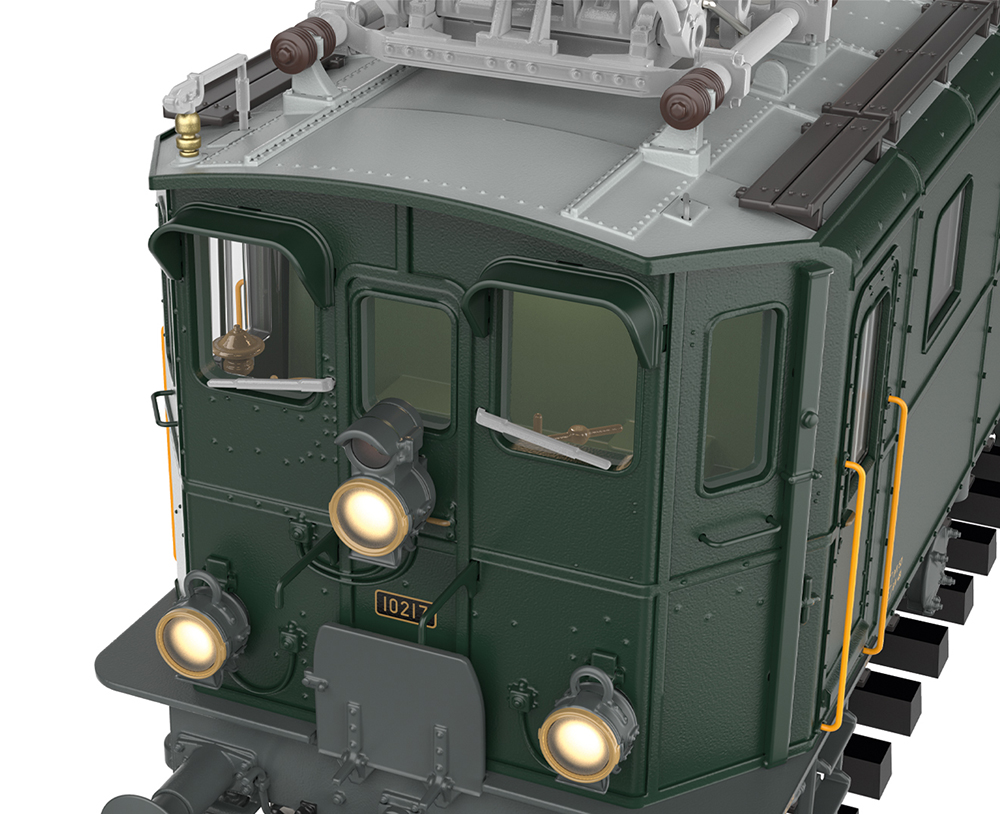 Model: With digital decoder and extensive light and sound functions. Controlled high-efficiency propulsion with flywheel. One axle driven. Traction tires. Directional triple headlights and one white marker light (Swiss light change) operate conventionally and can be digitally controlled. Lighting can be switched to one red marker light when running solo. Wrong-way signal can be digitally controlled separately. Headlights on locomotive ends 1 and 2 can each be switched off separately. Double-A headlight function. Additional cab lighting, control panel lighting, flashing lights at the switchgear, and engine room lighting are each separately digitally switchable. Lighting with maintenance-free warm white and red LEDs. With energy storage. Highly detailed metal construction with many separately applied details. Cab and engine room interiors. Detailed roof equipment including roof lines, insulators, and walkways, as well as pantographs. Minimum radius for operation: 360 mm. Brake hoses and screw coupling imitations are included.
