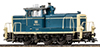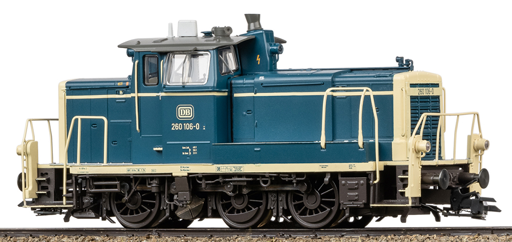 Prototype: German Federal Railroad (DB) class 260 diesel switcher locomotive. Ocean blue/ivory basic paint scheme. Diesel-hydraulic drive with jackshaft. Nose sections and cab from the series production version. Reinforced radiator grille with a wide frame. Cab roof design of locos up to about road number V 60 390. Cab roof with ventilation hatches. With a train radio and inductive magnets on both sides. First muffler design. With a “Dofa” stove and coal bunker. Road number 260 106-0. The loco looks as it did around 1980.