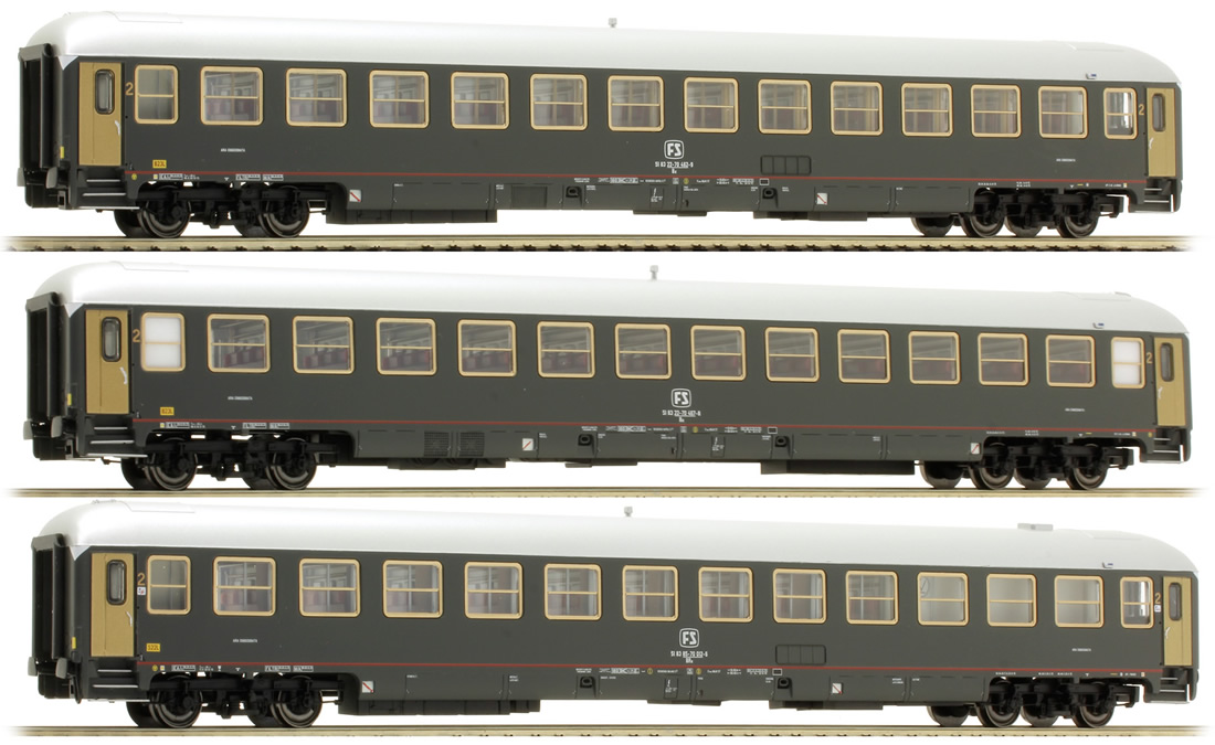 Additional set for “Rapido 905 ” train Milan – Rome – Naples, formed by two second class cars and one second class with snack point, all Type X 1970 with large skirt and thin red rib, used for cars allowed to run at 180 km/h.