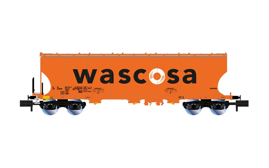 D-WASCO, 4-axle grain silo wagon with rounded side walls, orange color scheme, large "WASCOSA" logo