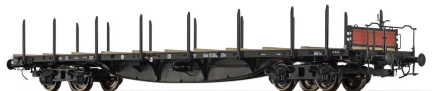 When the DRG [Deutsche Reichsbahn-Gesellschaft] was founded, a large quantity of rail carriages according to the Prussian standards were assumed meaning that, due to the modest financial means, there was no opportunity to procure high quantities of succession models. Although a 4-axle rail carriage was taken into consideration during the set-up of replacement construction drawings, only a limited amount of 95 units were built. Demand for a new 4-axle rail carriage only grew with the emergence of welding technology and the armament of the German Reich. Consequently, multiple prototypes and ranges with numerous differences were created in quick succession. In 1934, SEAG supplied the first two trial wagons. They were produced using St 52 and also had a removable wooden or steel brakemanÔÇÖs cab respectively. The further deliveries up until 1939 were also produced using St 52, had three cross-members and seven stake pairs. The brakemanÔÇÖs cab was removable. An amended variant was built from 1941 onwards. This now consisted of the weaker St 37 which meant that a fourth cross-member had to be included. Accordingly, there were now eight lateral stake pairs. For vehicle transports, the brakemanÔÇÖs cab only had a foldable platform railing. At the request of the Wehrmacht, all of the older wagons had to be converted in this manner. The first deliveries boasted a welded box bogie but all later deliveries were equipped with the press plate bogies. In addition to the deliveries to the DR, the Wehrmacht also received wagons and used them for military purposes, e.g. in the trains of the mobile V2 ramps. In total, approximately 3,500 wagons were built by the end of the war. After 1945, the welded rail carriages were distributed throughout half of Europe. In France, the equipping of these carriages with new bogies is still common. At the end of the war, DB had approximately 1,400 wagons in the inventory and it is estimated that DR had about 500. Both railway companies continued to use the wagons for a long period of time and they were only withdrawn in the 1980s. Even in 1979, DB had over 1,000 of the wagons bearing the R 672 designation in use. The original wagons were withdrawn earlier in the DR. However, the lack of wagons in the 1980s lead to the last R 672 wagons being purchased from DB. DR designated them as Rkk [3811] and used them until the slump in traffic volume in 1990.