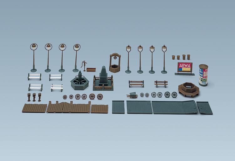 This construction kit is very well suitable for the decoration and modelling of a small town or village square. For this purpose it contains typical parts such as park benches, a bench around a tree, advertising pillar, different types of fountains, a historical monument, fire hydrant, yard gates with side walls and much more.