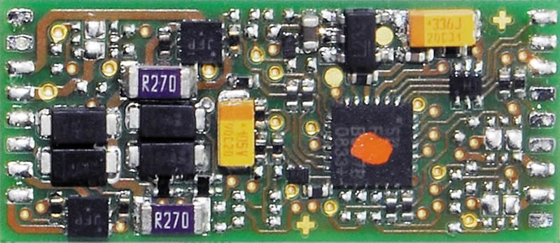 The function decoder 686401 is a decoder designed merely for switching of functions on and off on a DCC system, for example, lights. It has not motor connection and can be installed in ordinary coaches, or similarly a control cab coach, to change the headlights or simply to turn the interior lighting on or off. It will even work on standard DC layouts to change the lights prototypically. The decoder has 4 outputs of which two are for the white/red light changeover. Two additional outputs can be activated by functions f1 or f2 of the controller. These allocations can be changed as desired. Each output can cope with a load of 200mA. The brightness of each output can be set individually (dimmed), or can be used to operate flashing lights.