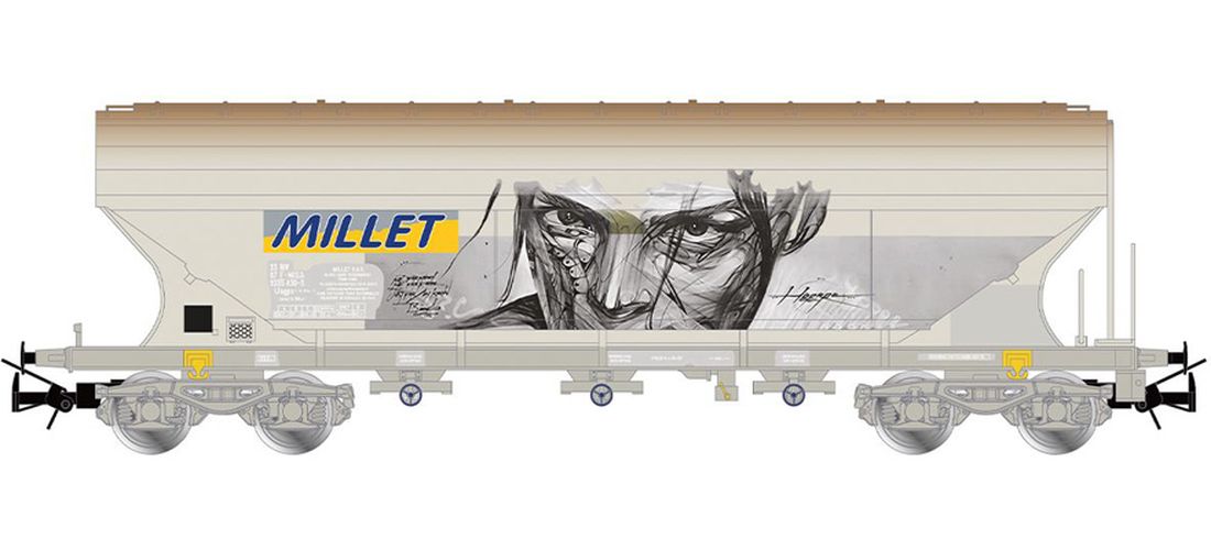 4-axle grain silo wagon with straight side walls“MILLET”, grey paintwork with graffiti