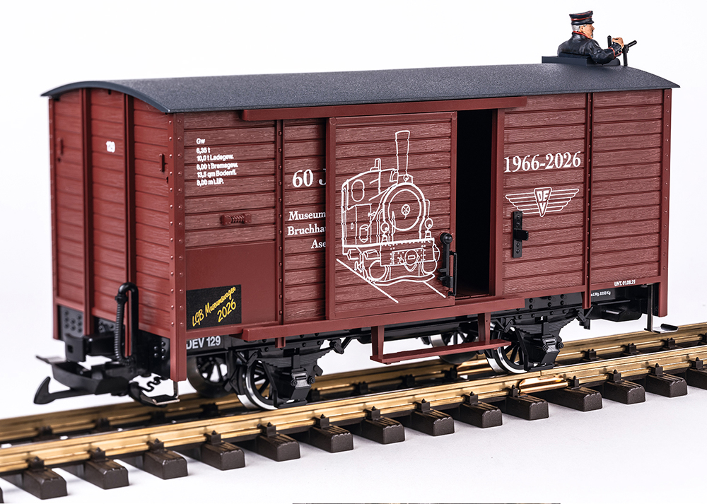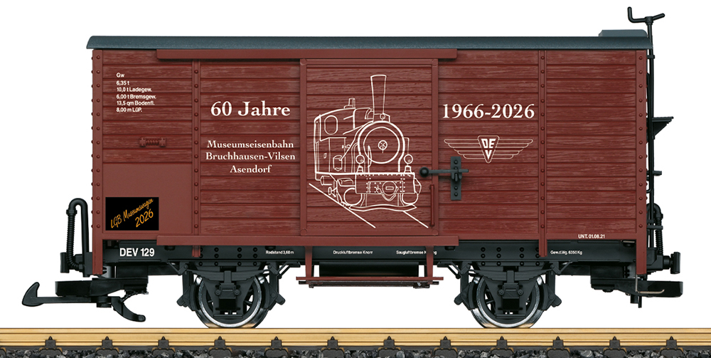 The German Railroad Association (DEV) in Bruchhausen-Vilsen is 60 years old in 2026 and LGB congratulates this anniversary with the Museum car. As a Museum car a boxcar has been selected with a special imprinting for the 60th anniversary. This car is in use on the DEV with this beautifully designed side wall. There is an open brakeman's seat on one end of the car. A figure of the brakeman Guido is sold by the DEV to go with this brakeman's seat. The side sliding doors can be opened and there are metal wheelsets. Length over the buffers 30 cm / 11-13/16".