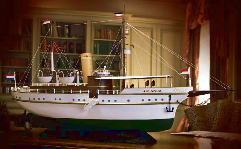 Model: Reproduction of a Märklin propeller-driven steam ship from around 1910. The hull and the superstructure are constructed of metal. The ship comes with an anchor chain with an anchor. The anchor can be raised with a sprocket wheel. The ship has a movable ladder on the larboard and starboard sides. The superstructure parts, intake guides, rescue boats, masts with the rigging, etc. are finely represented. The ship has a built-in windup motor for driving the ship's propeller. The rudder can be moved with the wheel on the deck. A wave base that can be rolled is included and the ship can placed on it for decoration and can be moved with it. Length of the ship approximately 82.0 cm / 32-1/4".