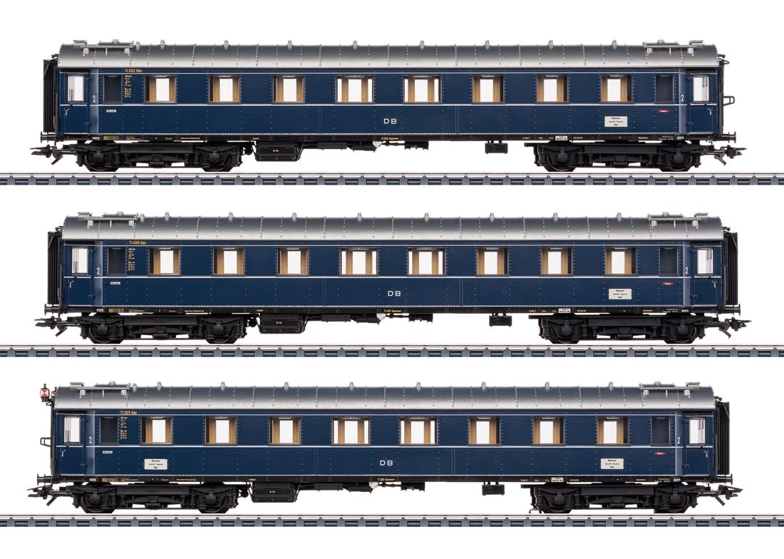 Model: These cars are detailed versions with full scale length. All the cars have factory-installed LED interior lighting with warm white LEDs and buffer capacitors. One car has factory-installed marker lights at one end. The pickup shoe on this car supplies current via the factory-installed current-conducting close coupler heads to the entire car consist. A fixed defined car sequence is prescribed for this purpose. Both ends of the car consist have the standard new close coupler heads for lower buffer heights. The passenger cars have multi-colored interior details. The trucks are type Görlitz II heavy. There are separately applied ladders and grab irons on the ends of the cars. The minimum radius for operation is 360 mm / 14-3/16". Total length over the buffers approximately 75.5 cm / 29-3/4".