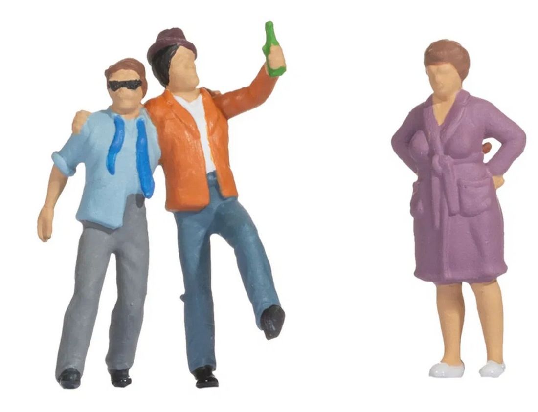 NOCH brings an amusing and realistic scene to your model railway layout with Funny-Scenes “Boozers”! This group of figures shows two good-humored friends who have obviously enjoyed a merry evening and are now making their way home arm in arm and with a bottle in their hands. But the third figure, a resolute lady in a bathrobe, is waiting for them with her arms crossed and a critical look on her face - she is clearly not happy about her “drinking brothers'” nocturnal activities!