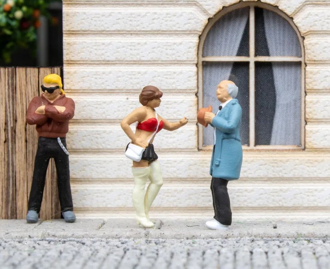 With Funny-Scenes ‘Kerb Crawling Area’ NOCH brings a daring and humorous scene for your model railway layout! This set shows what is happening on a street at night: An elderly gentleman looks embarrassed while a self-confident lady in a short outfit and striking pose seeks a conversation. Another man stands next to them with his arms crossed and a scrutinizing look on his face, as if he is observing the situation closely.
