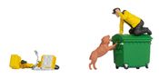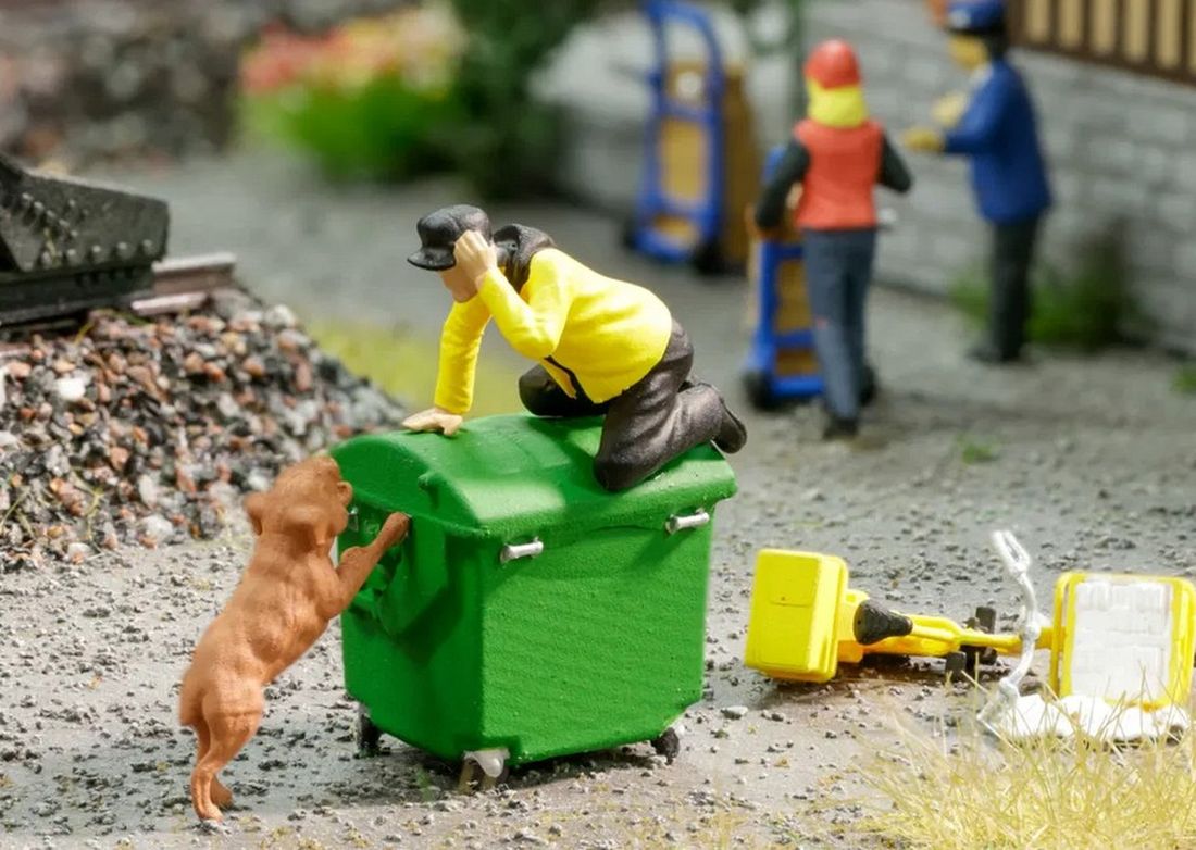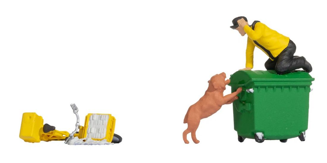 With Funny-Scenes “Caution Dog”, NOCH brings a lively and humorous scene to your model railway layout that is sure to cause a stir! This scene shows a man who is obviously on the run from a watchful dog. The gentleman has hastily dropped his bicycle and has climbed onto the dustbin out of sheer fear, while the dog tries to reach him, barking loudly and attentively. The overturned bicycle lies next to the container, surrounded by scattered garbage, which lends the scene additional dynamism and authenticity.