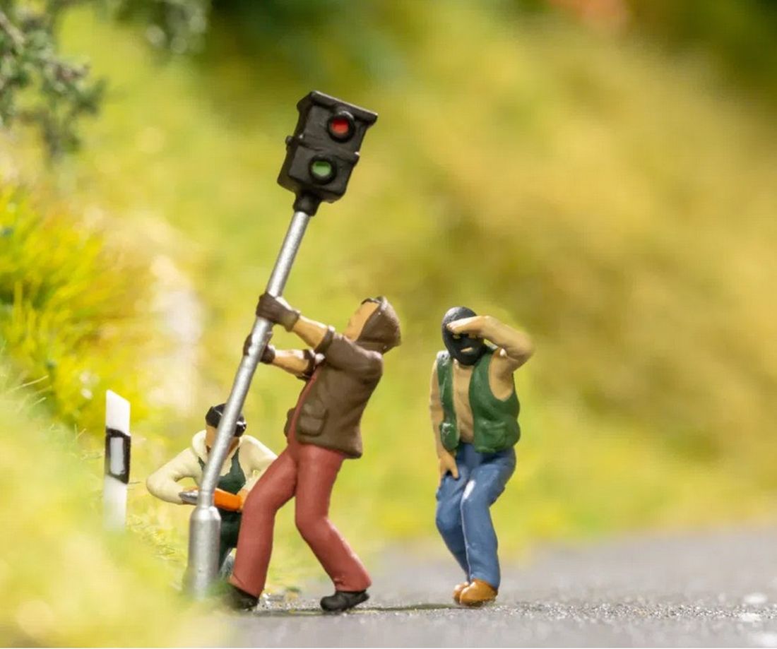 With Funny-Scenes “Too fast” NOCH brings a cheeky and exciting scene for your model world! This figure set shows a group of cheeky characters on an unusual venture: The three men are about to creatively incapacitate a speed camera! One is kneeling on the ground concentrating, another is holding the pole of the speed camera, while the third is on the lookout to ensure that the action remains unobserved.
