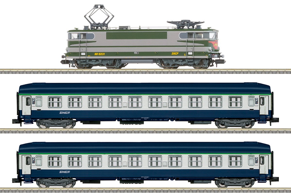 Prototype: French State Railways (SNCF) BB 9231 express electric locomotive in the special Arzens livery and two 2nd class couchette cars (B9c9x). Operating condition circa 1995.